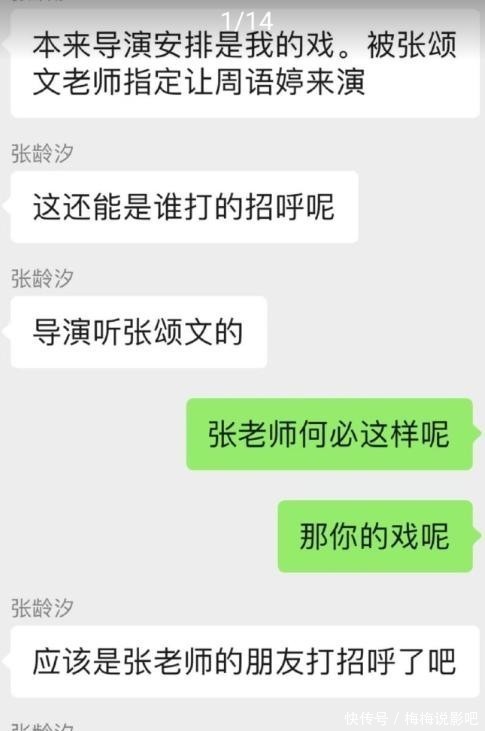 事情得从 1 月 7 日说起,那天女演员姜尘在自己的社交账号上突然甩出一系列重磅 “炸弹”—— 十多张聊天记录截图,瞬间点燃了网友们的吃瓜热情,让大家惊掉了下巴。其中一张聊天记录,来自她和女演员张龄汐的对话。张龄汐满肚子委屈,向姜尘大吐苦水:“本来我都已经定好要演那部剧的一个角色了,导演都点头了,一切顺风顺水的,结果,半路杀出个程咬金,张颂文老师突然插手,指定让周语婷来演,我这一下子就懵了,所有努力都白费了。” 从这对话框里的只言片语,咱仿佛都能看到张龄汐在屏幕那头欲哭无泪的模样。